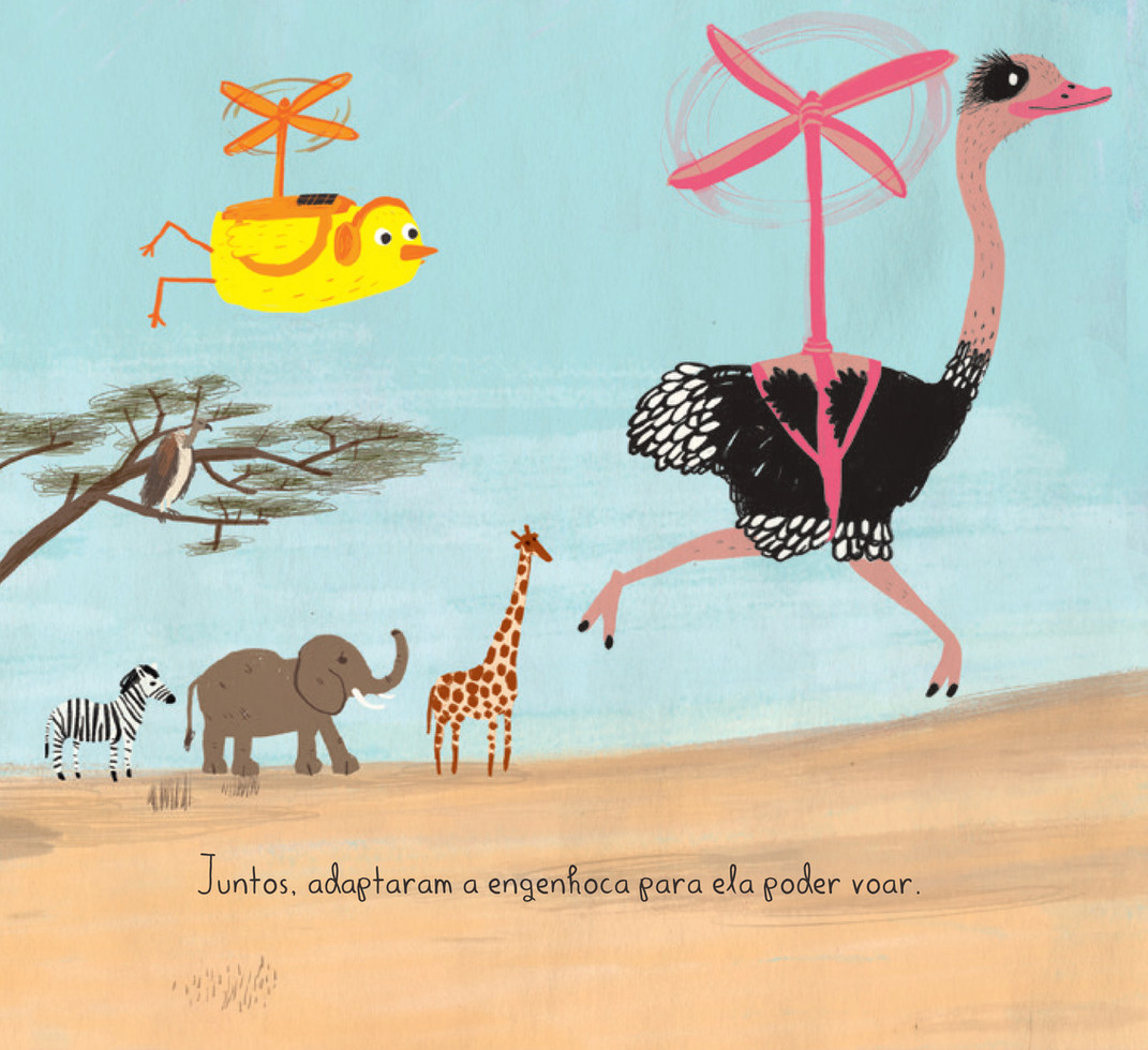 O Pássaro Amarelo é muito inteligente. O que ele mais gosta de fazer é passar o dia em sua oficina criando coisas novas que os outros pássaros adoram usar. Um dia, porém, seus amigos aprendem a voar e vão viajar pelo mundo. Pássaro Amarelo, que nasceu com as asas curtas, não pode voar e se entristece ao receber os postais que seus amigos mandam. Mas com a ajuda de Téo, o macaco carteiro, os dois criam um dispositivo que lhe permite realizar seu sonho. Trata-se de um livro que ajuda a refletir sobre as invenções que melhoram a vida das pessoas e suas comunidades, e também sobre a importância da cooperação e das amizades na superação de nossas próprias limitações.
